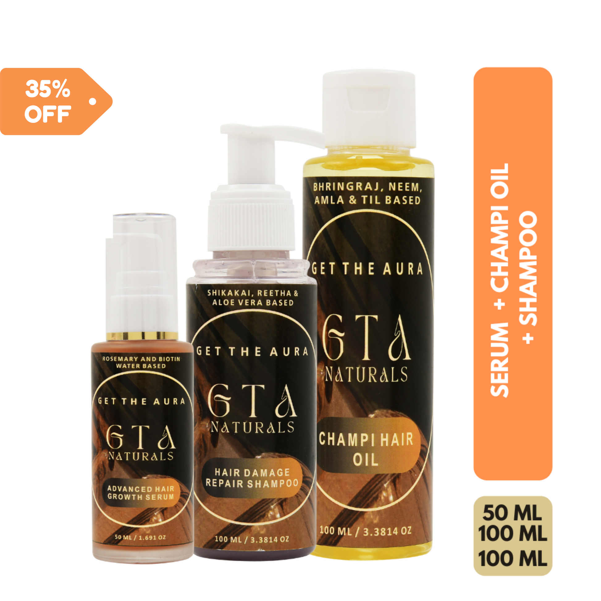 Level up your hair care game with GTA Naturals’ MahaCombo – the ultimate trio for those who want real, visible results. Now with a larger 50ml serum and a potent blend of herbal ingredients, this combo is crafted to restore, revive, and regrow your hair—naturally and effectively.
