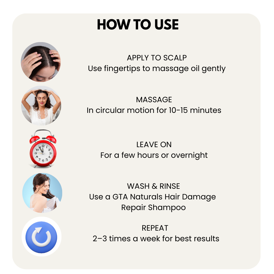 - Massage into scalp and leave for 2–3 hours or overnight